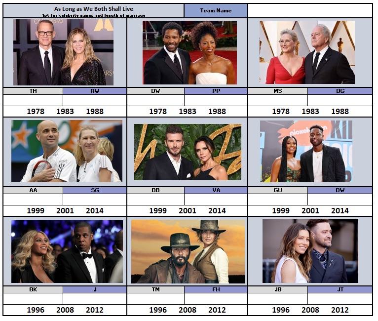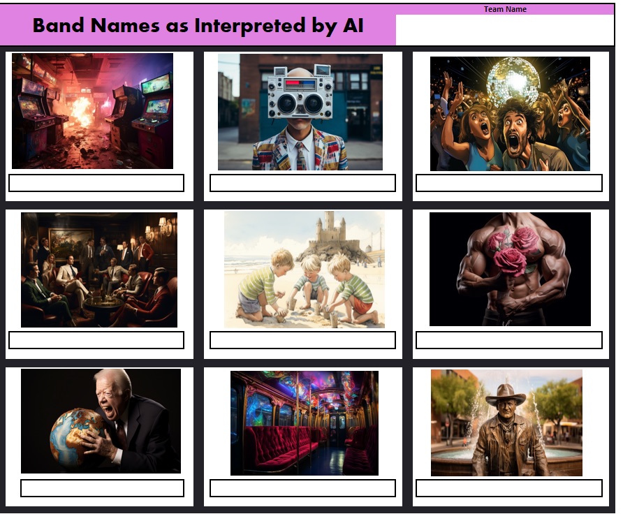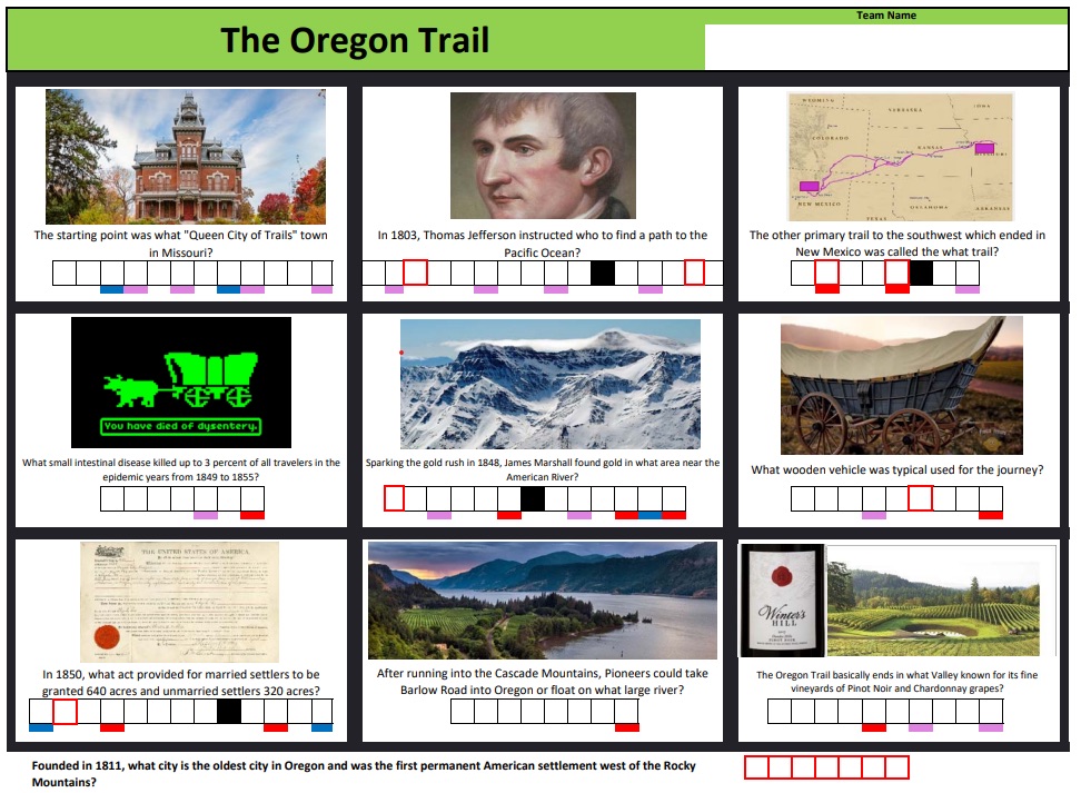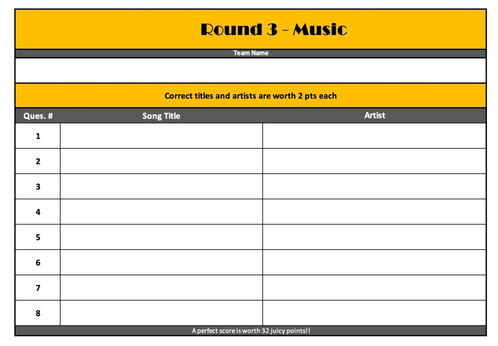 Includes several rounds of general trivia questions, a puzzle round, a music round and lightning questions. Trivia is typically hosted using pencil and paper, but phone apps can be used for larger crowds